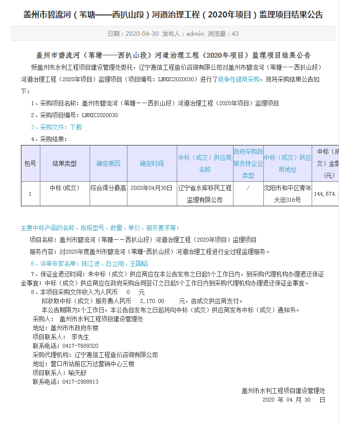 遼寧省水庫(kù)移民公司中標(biāo)蓋州市碧流河(葦塘——西扒山段)河道治理工程(2020年項(xiàng)目)監(jiān)理...
