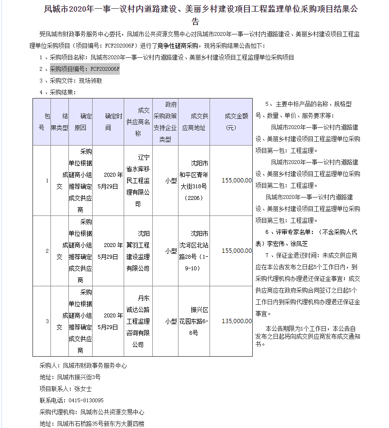 遼寧省水庫(kù)移民公司中標(biāo)鳳城市2020年一事一議村內(nèi)道路建設(shè)、美麗鄉(xiāng)村建設(shè)項(xiàng)目工程監(jiān)理...