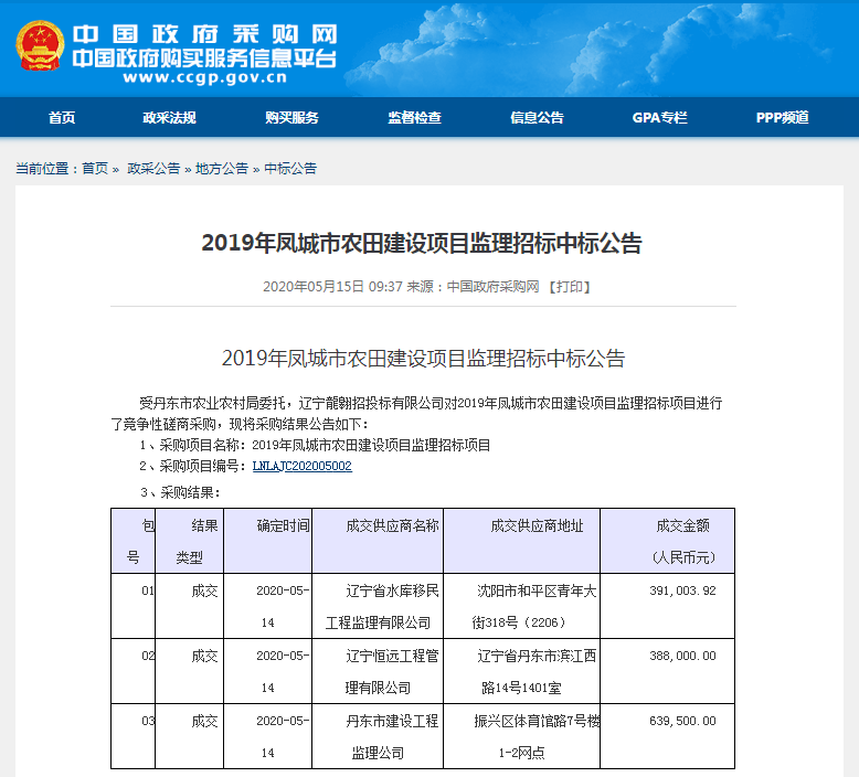 遼寧省水庫(kù)移民公司中標(biāo)2019年鳳城市農(nóng)田建設(shè)項(xiàng)目監(jiān)理01包