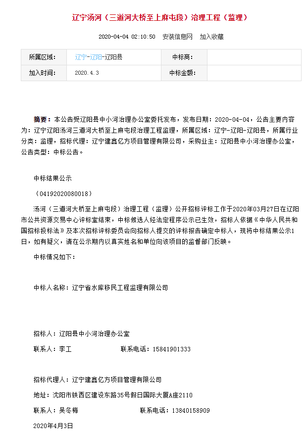 2020年4月3日,經(jīng)評標(biāo)委員會綜合評審,確認(rèn)遼寧省水庫移民工程監(jiān)理有限公司成功中標(biāo)遼寧湯河(三道河大橋至上麻屯段)治理工程(監(jiān)理)項(xiàng)目。